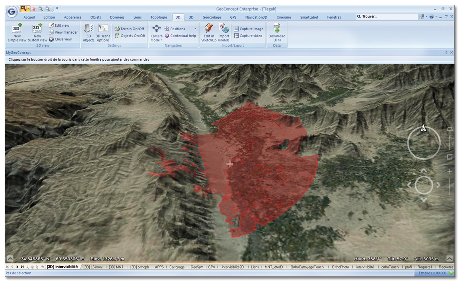 The module enables you to use all the GIS data in 3D: terrain, textures, objects, texts, themes, models...